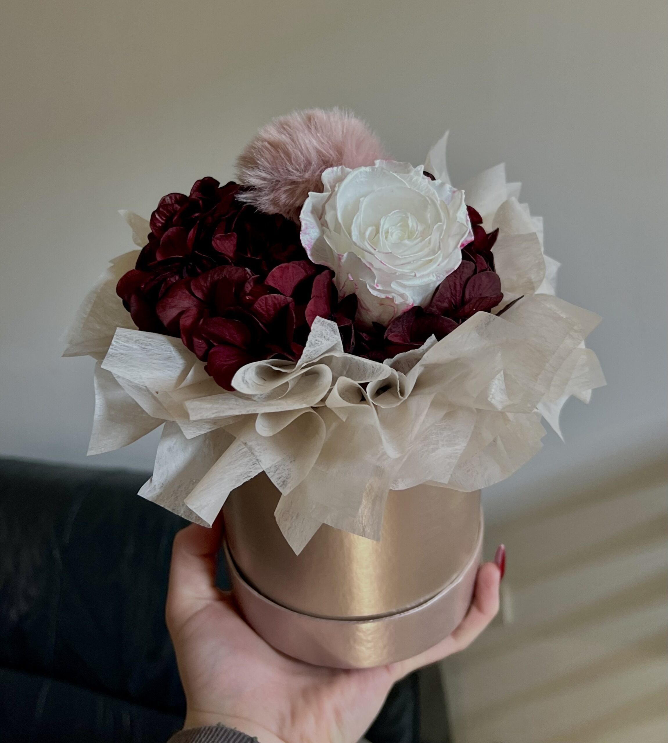 Profinjena cvjetna kutija u brončanoj nijansi s tamnom i svijetlom ružom te dekorativnim vječnim cvijećem.