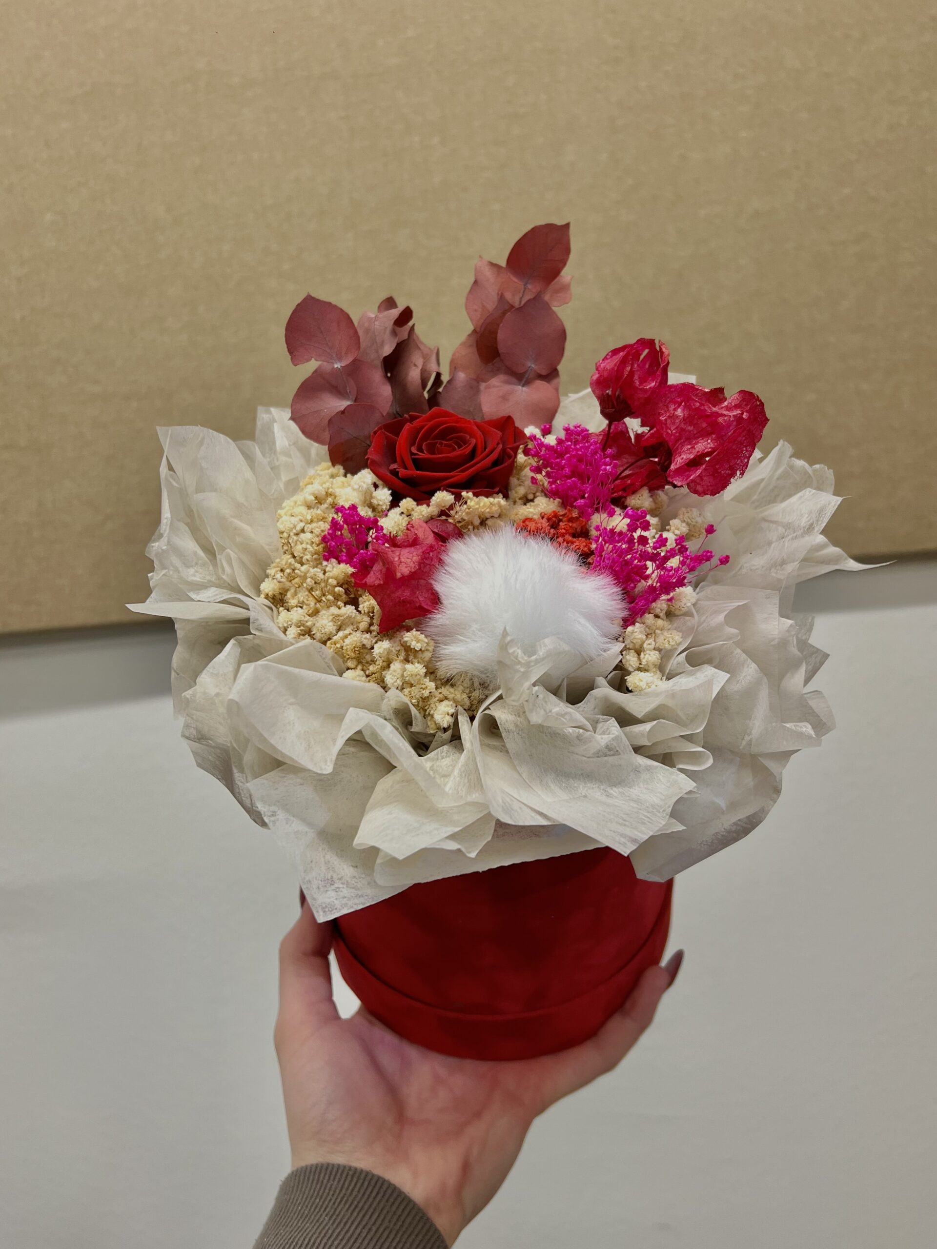 Romantična crvena cvjetna kutija s ružama i bogatim dekorativnim vječnim cvijećem.