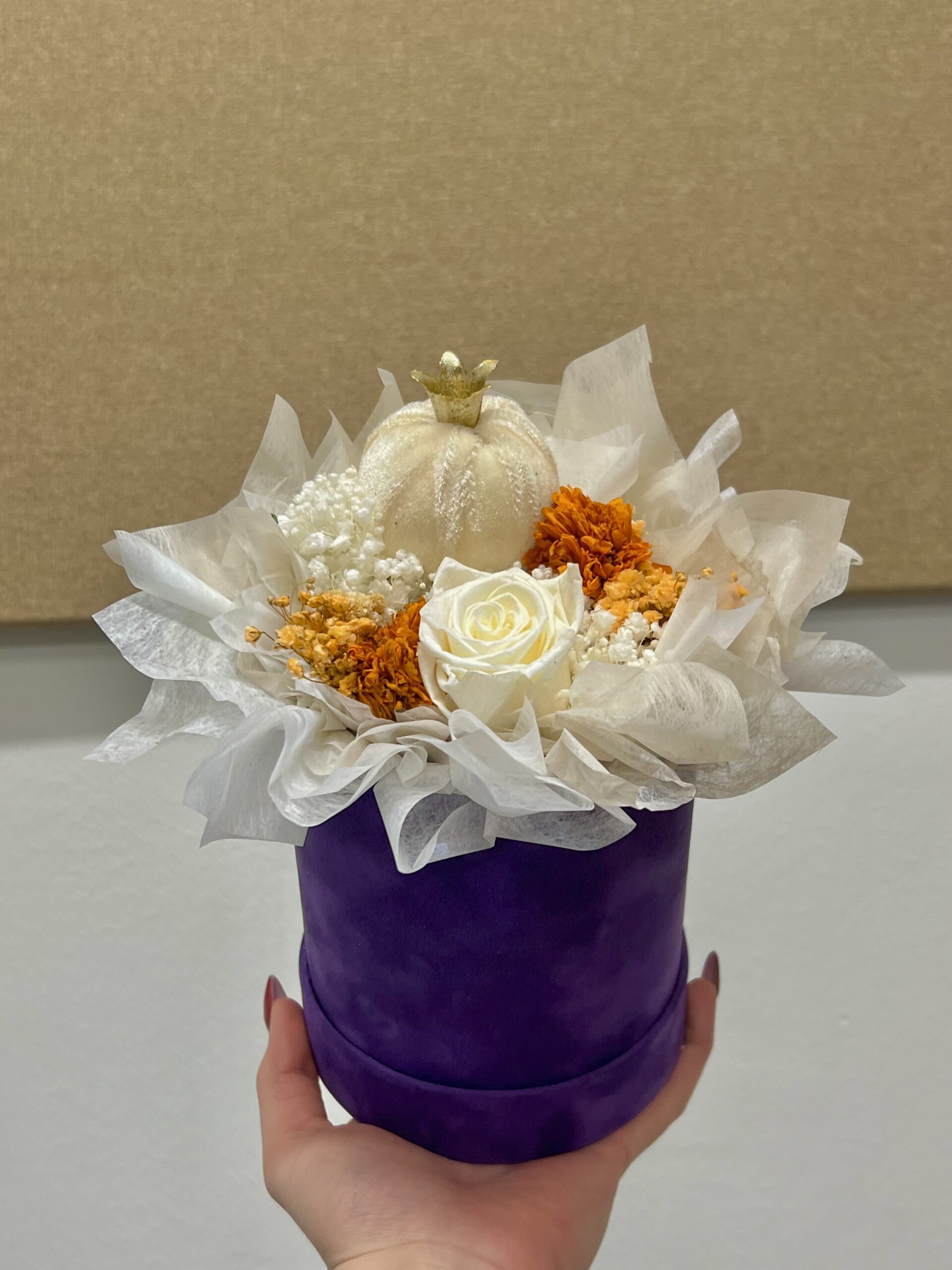 Kontrast ljubičaste kutije i toplih cvjetnih tonova daje aranžmanu vedar, moderan i poseban izgled.