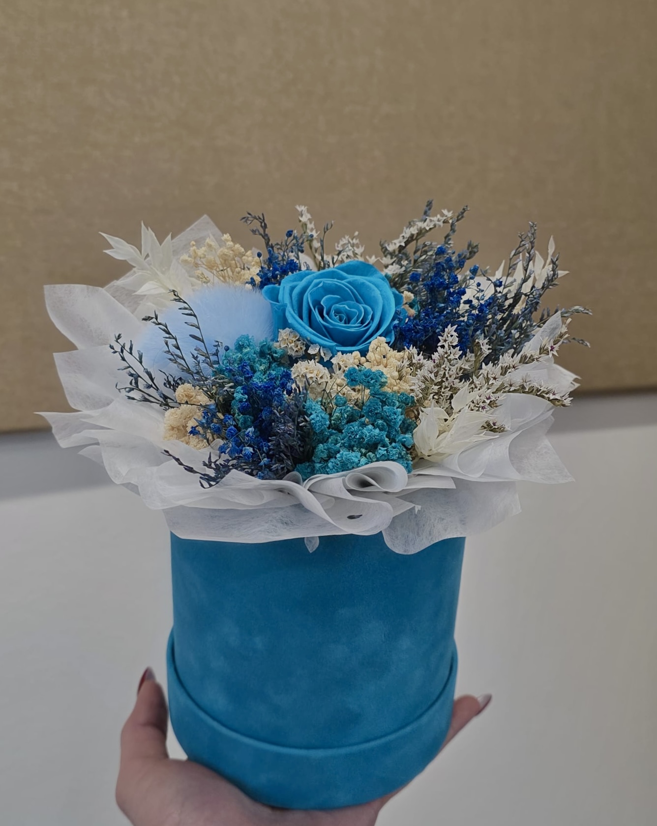 Moderna plava cvjetna kutija s plavom ružom, plavim dekorativnim detaljima i pažljivo složenim vječnim cvijećem.