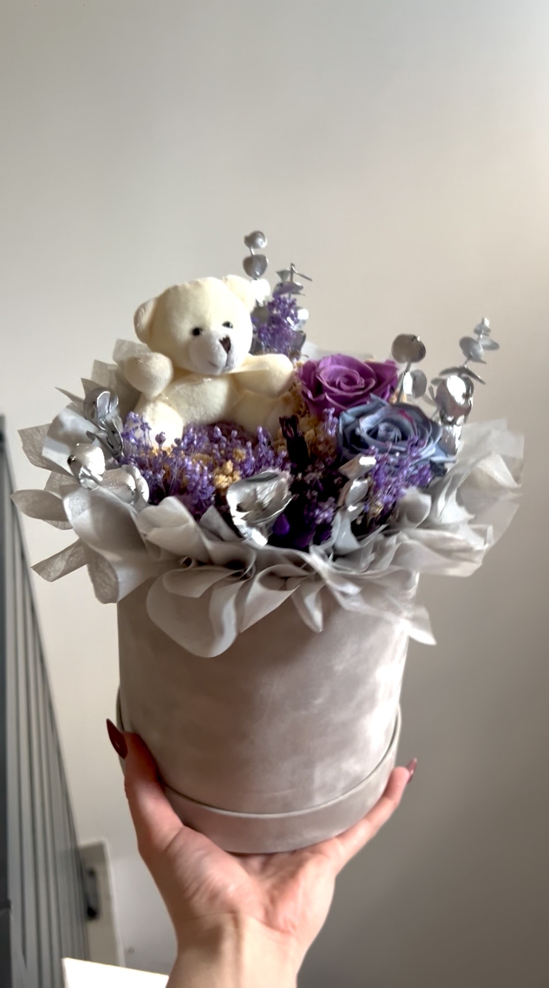 Srebrna cvjetna kutija s ljubičastim detaljima i vječnim cvijećem.
