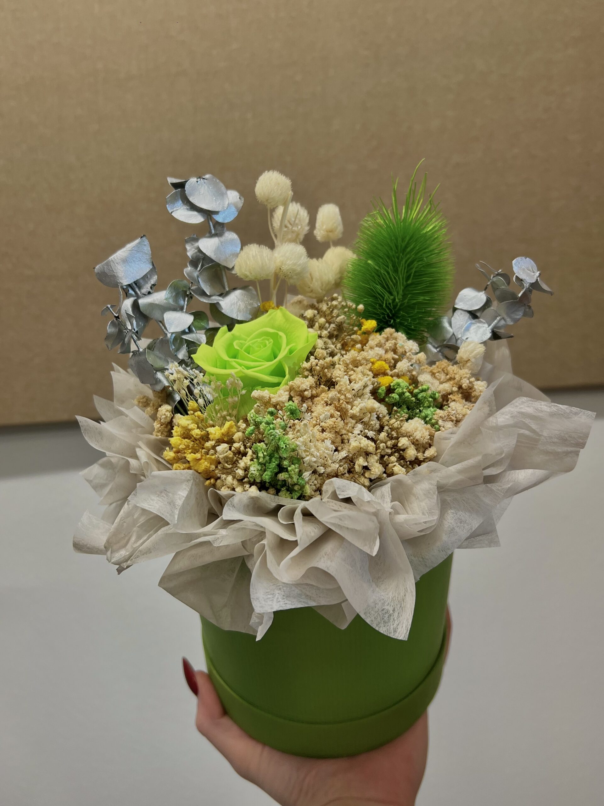 Svježa zelena cvjetna kutija s prirodnim tonovima, dekorativnim cvijećem i pažljivo složenim detaljima.